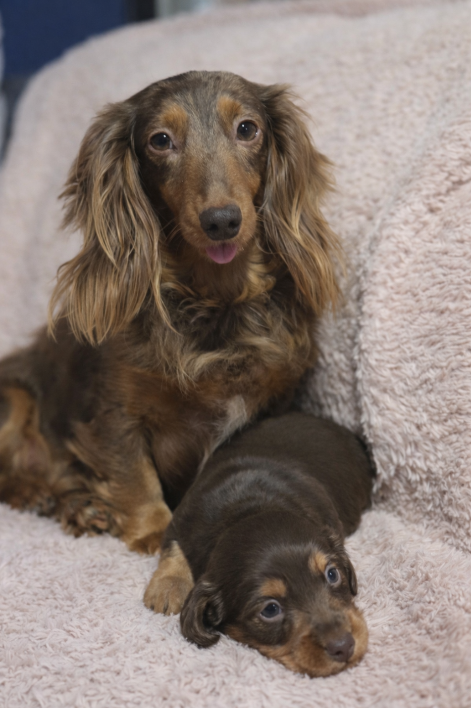 Magnifique femelle Teckel poil long nain/ kaninchen LOF, de couleur chocolat, issue de parents LOF testés et indemnes pour les maladies génétiques propres à la race.